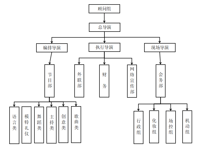 晚会筹备组由顾问组、导演组、外联部、网络宣传部、会务部、节目部、财务构成,具体组织架构如下: