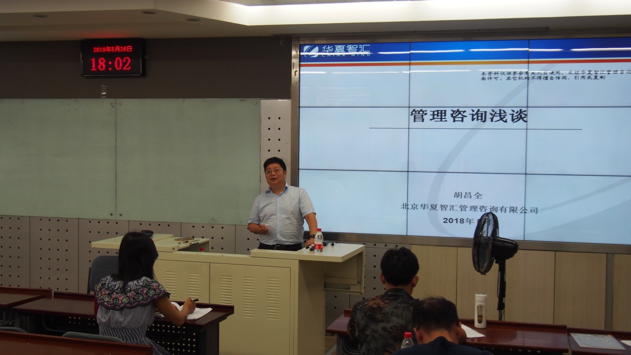 2018年5月26日下午18点,北航新主楼A618教室座无虚席,由社会导师北京华夏智汇管理咨询有限公司董事长、首席咨询师胡昌全先生分享关于《中国管理咨询》面对面交流活动。