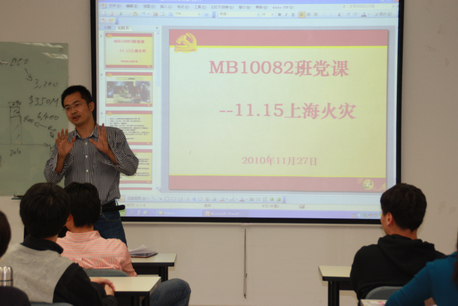 2010年11月27日17时,北航MB10082支部书记魏延才将自己近期收集11月15日上海特大火灾事故相关音视频、图片资料以及善后处理、社会反映等情况展现给大家。新主楼A1048教室,20余名党员和积极分子都屏住了呼吸,现场惨烈的场面、亲人们焦急的等待、伤者在医院的痛苦、市民手捧鲜花的祭奠………,令在场者无不动容。