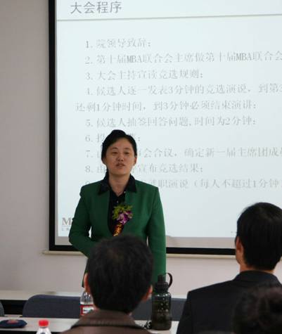 周院长代表学院首先发言,作为北航MBA中心的首任主任,周老师为联合会的成立以及发展倾尽了心血,因此,她的发言充满了对联合会的感情和对MBA联合会工作的支持,令在座所有同学深受感动。苏主任的发言同样精彩,兼具学者和企业高管双重经历的苏老师也一改往日的严谨作风,轻松幽默的语言不时从嘴边流出,看来,细心的人力资源专家苏老师是怕竞选者们太过紧张发挥不好,在用自己的行动来驱赶选手们的紧张情绪——行家一出手,就知有没有。